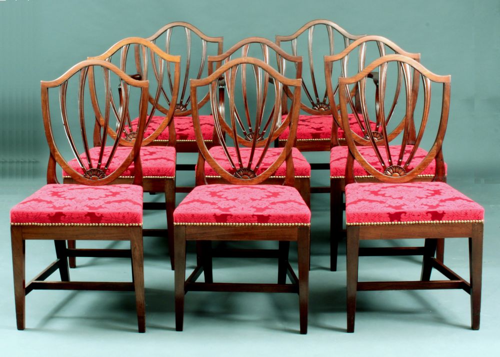 Good set of  8 (2 arms and 6 singles) mahogany Hepplewhite period shield back dining chairs:: generous size.