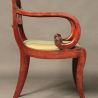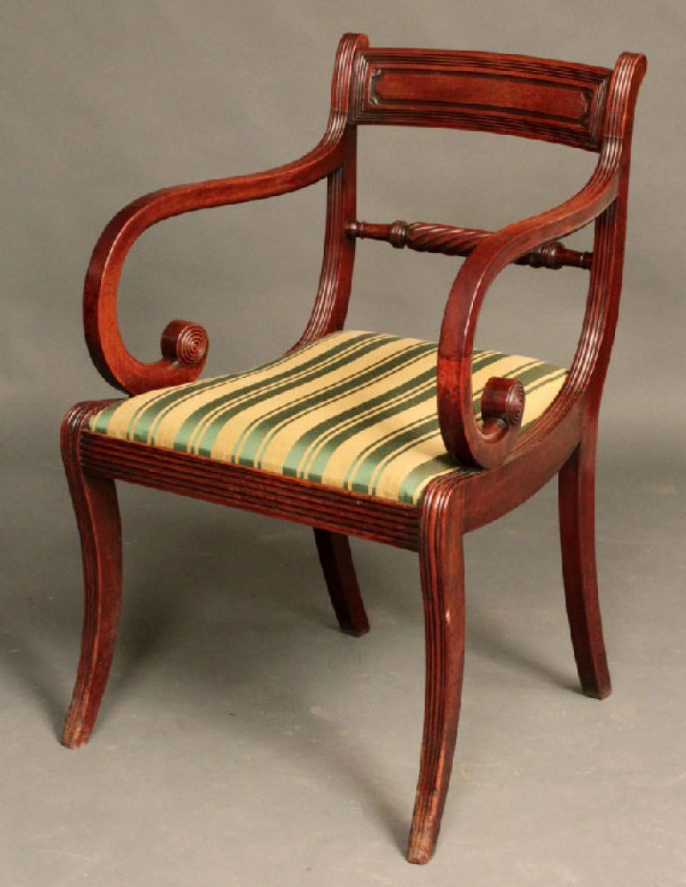 A Regency mahogany rope back sabre leg desk chair with scroll arms