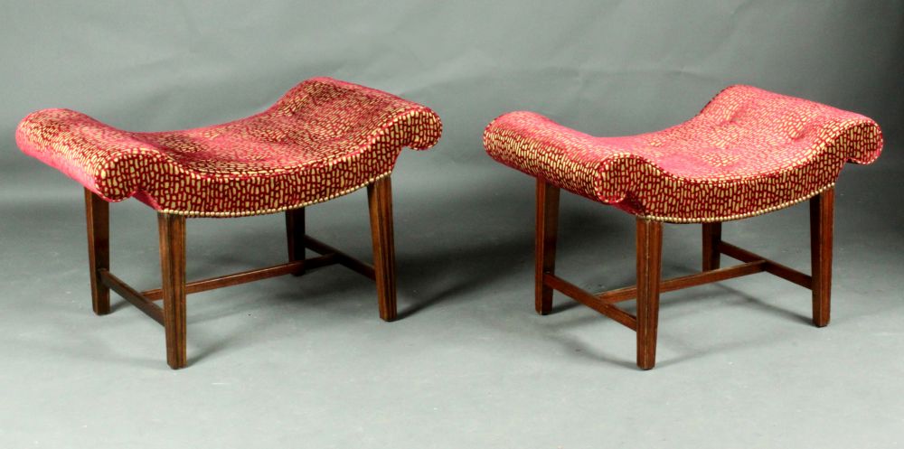 A good pair of late 18th century Sheraton period mahogany saddle-seat stools / window seats with scrolled ends and moulded legs