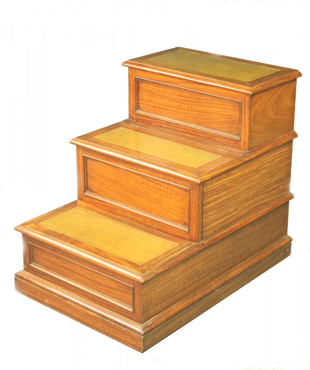 Unusual satinwood bedsteps of a good generous size; still retains its original interior though this could easily be modified; three steps with leather inserts on each step; was originally a piece of furniture for the dining room or library