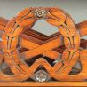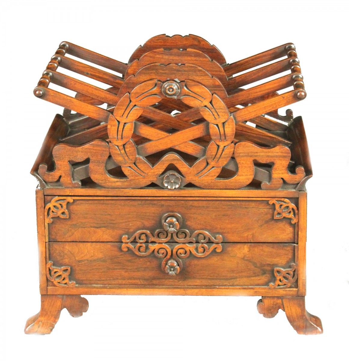 A good Regency rosewood canterbury: rare model with 2 drawers; the divisions in the form of an X supported by carved circular laurel wreaths; the two drawers with carved corners and a carved motif in the centre.