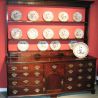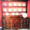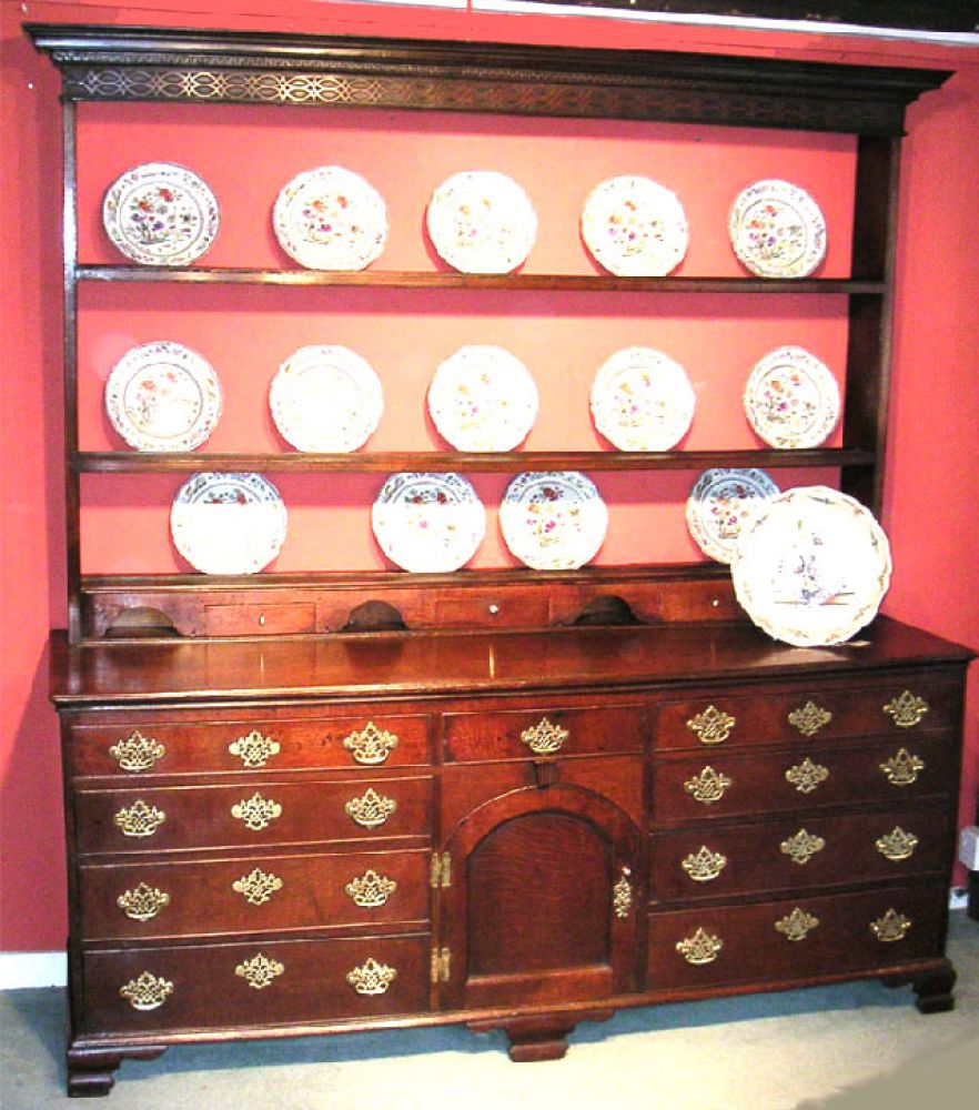 A handome mid 18th century oak North Country dresser with typicalarchitectural detail: blind fret frieze matching the original fret handles, central arched cupboard with keystone above, spice drawers and ogee bracket feet c. 1760