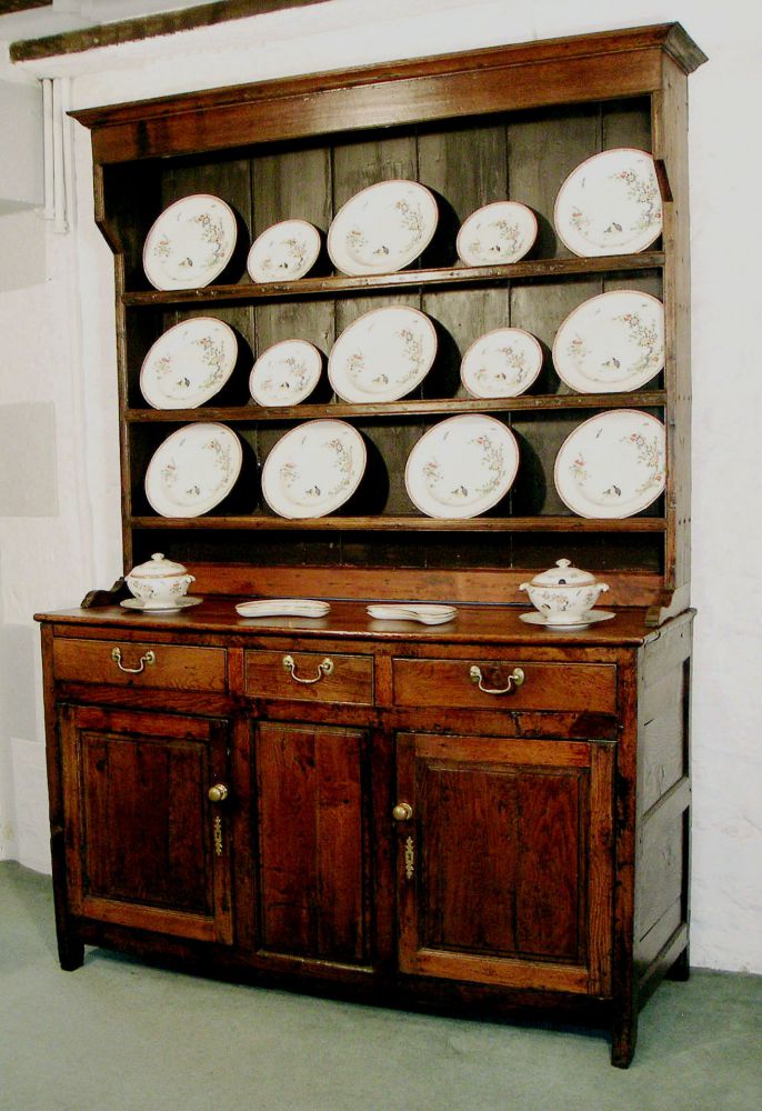 A small Welsh oak cupboard dresser with the original rack and fielded panel doors