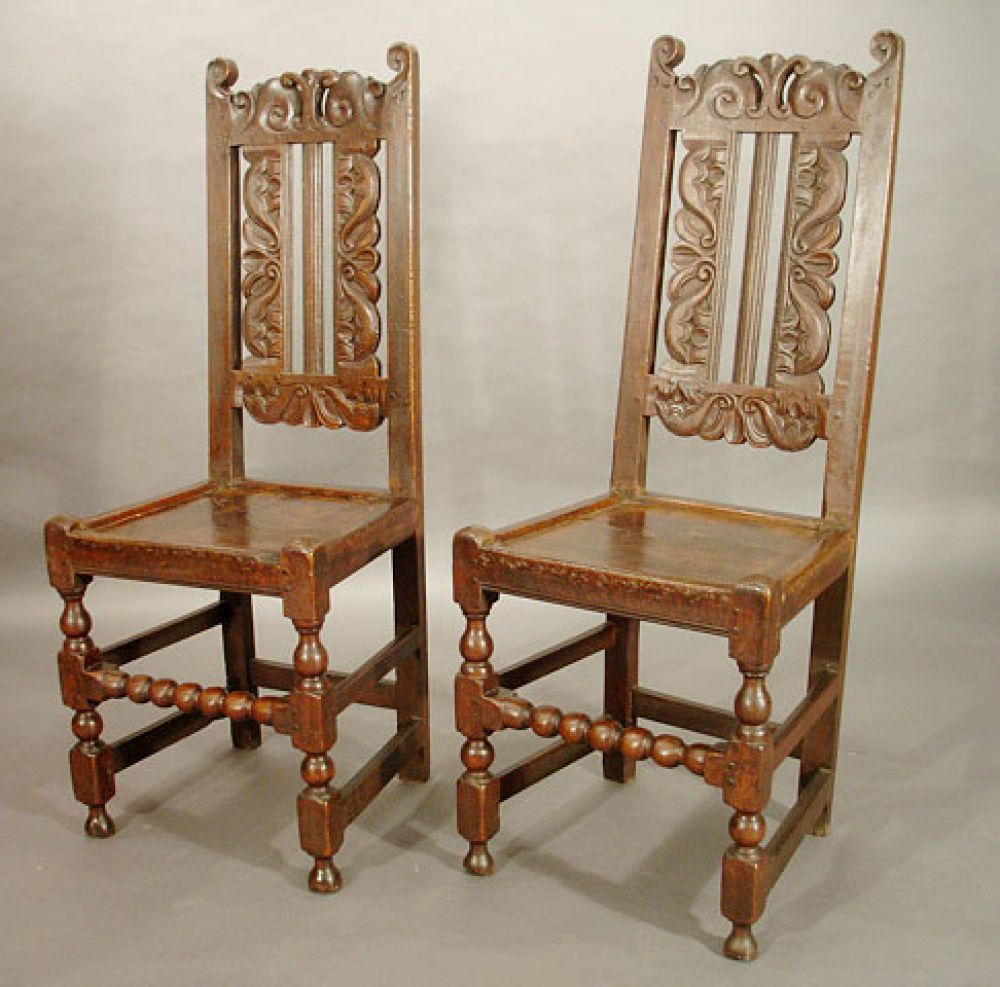A pair of Late 17th century oak back stools with elaborately carved backs