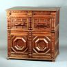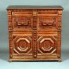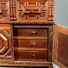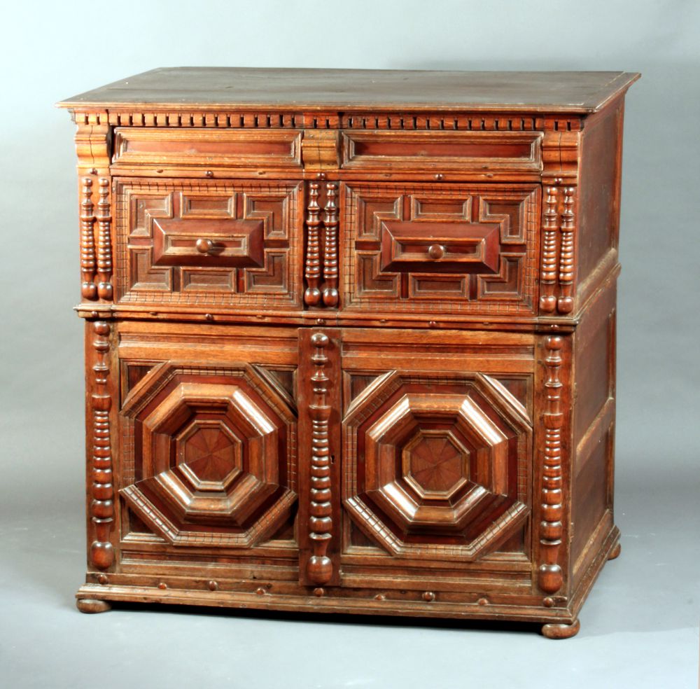 A mid C17 joined oak chest with geometric moulded cushion drawer fronts, partly veneered in snakewood and with fruitwood balusters; the cupboard doors below enclosing drawers