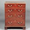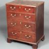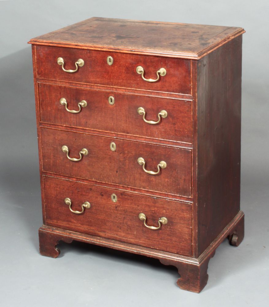 A small George III oak and pine chest of drawers only 27” wide; all original with cleated top and swan neck brasses