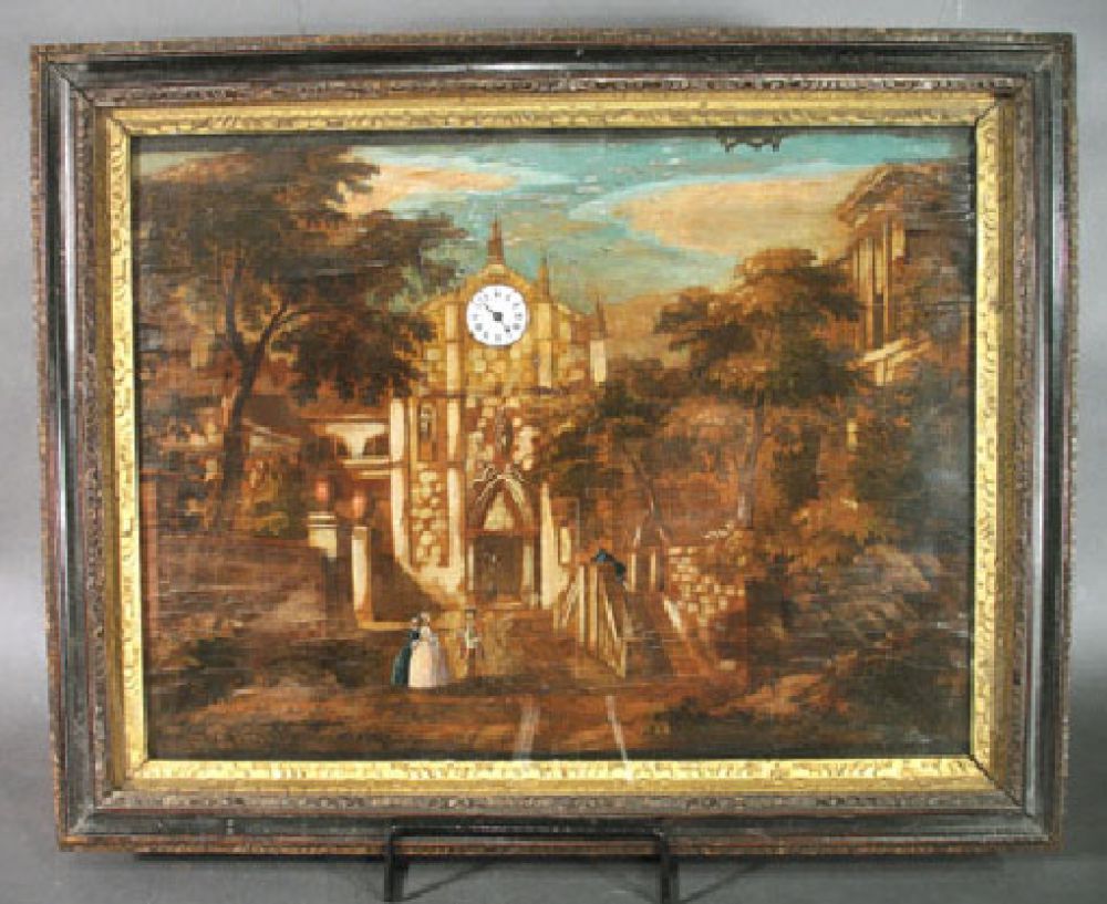 A rare late C18 clock picture, hand coloured over an engraving: the fine quality pierced and engraved watch movement by Thomas West (No. 984), original frame