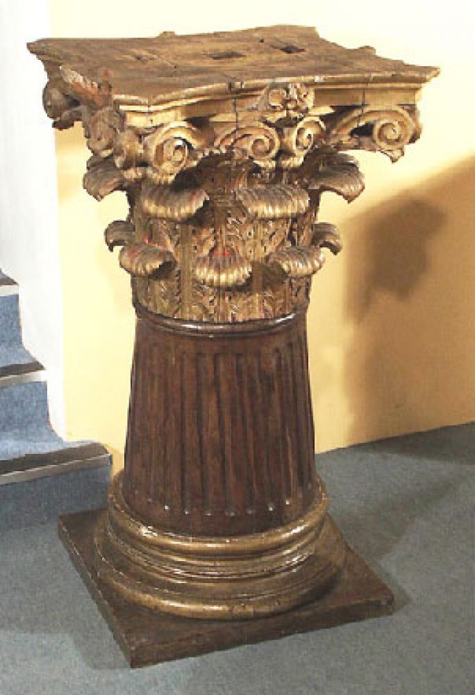 Carved wood Corinthian column: assembled from an C18 capital and base; the central fluted pillar probably made to go with them over 100 years ago.