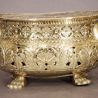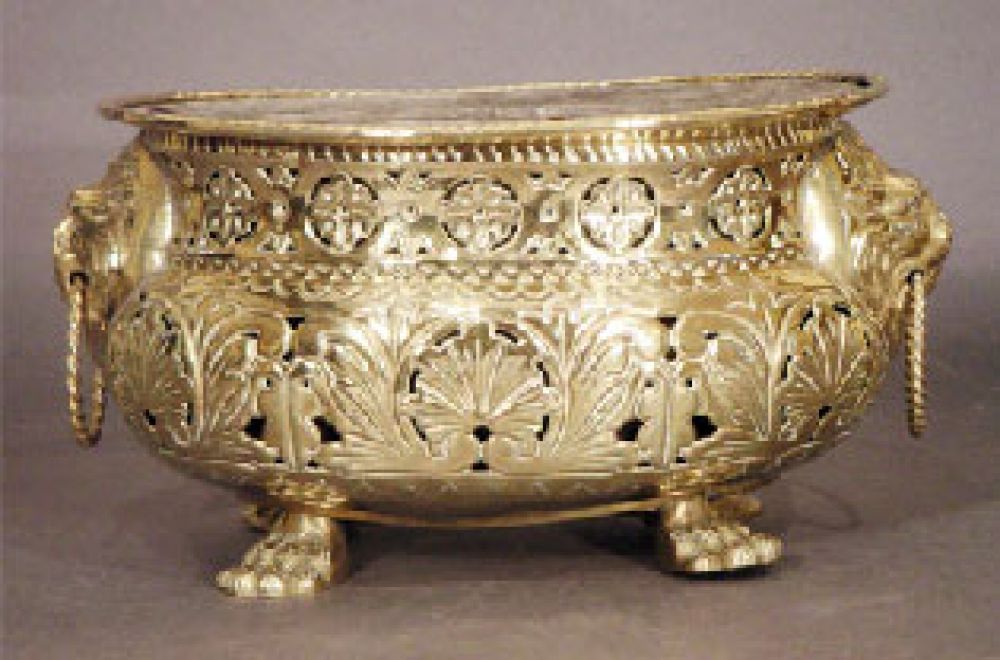 French repoussee brass jardinière with lion mask handles and paw feet: tin inner liner