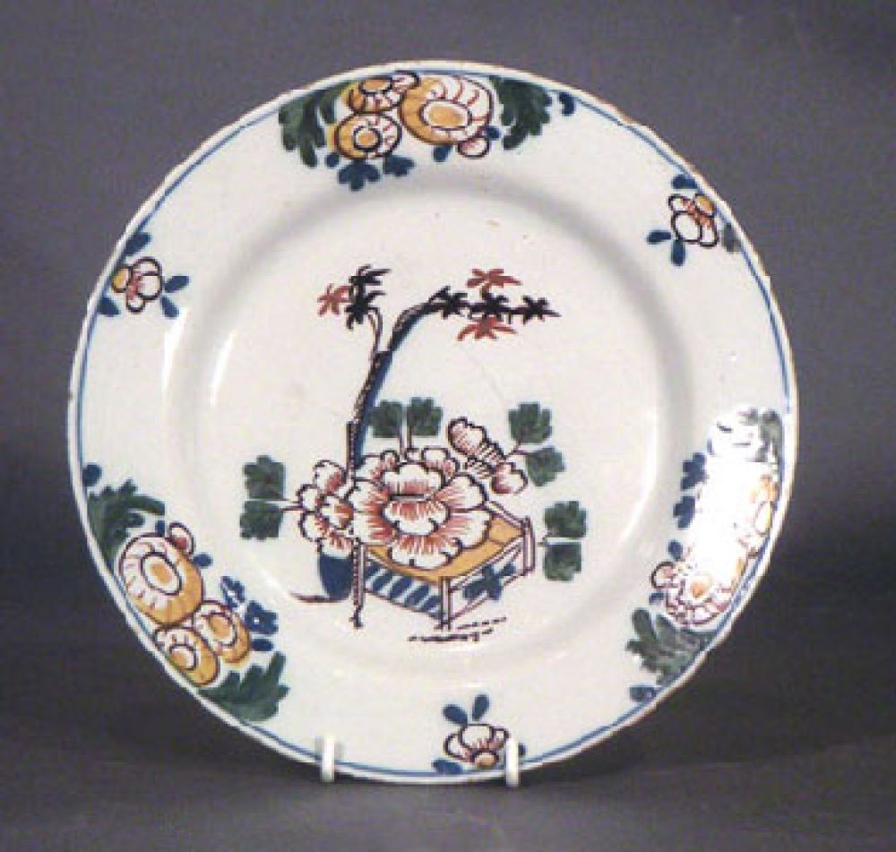 3417 Lambeth Delft polychrome plate – peonies and a tree c.1770