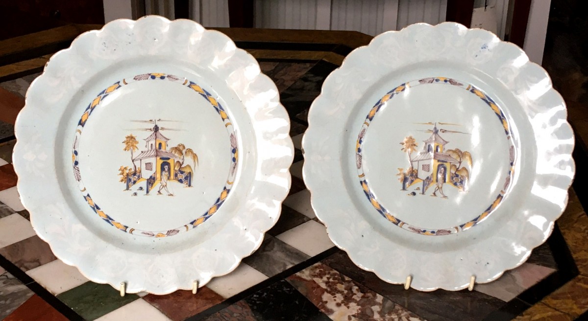 A pair of Bristol, probably Redcliff Back, bianco sopra bianco scalloped shaped plates with polychrome chinoiserie centres c.1765