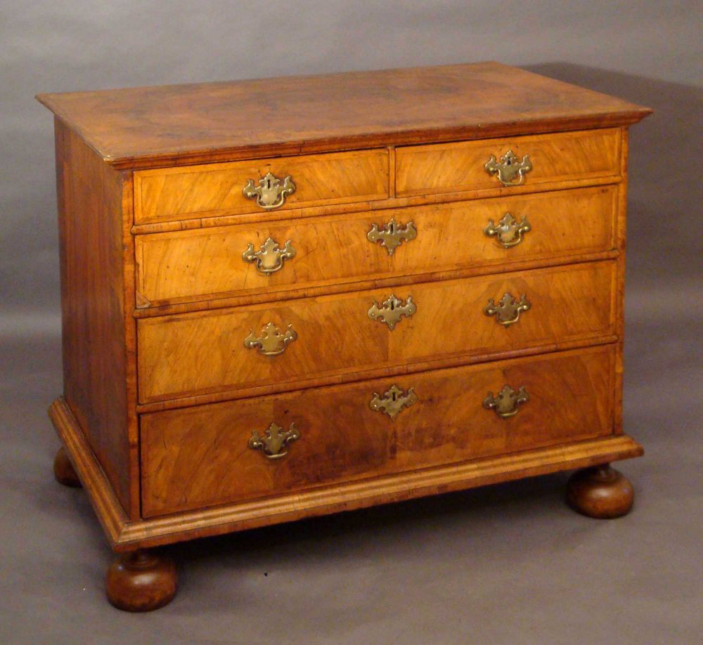 A William & Mary veneered walnut chest of drawers with chevron banding, quarter veneered top - the handles are old replacements c. 1700