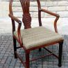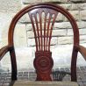 The influences are largely Hepplewhite, with the hoop back having vase-shaped splat with carved roundel in the lower part.  The arms are straight and betray a strong Chinese influence and the stretchers are rounded, a feature which is almost exclusively Oriental.  Another rare and unusual feature is the carving to the reverse of the splat.