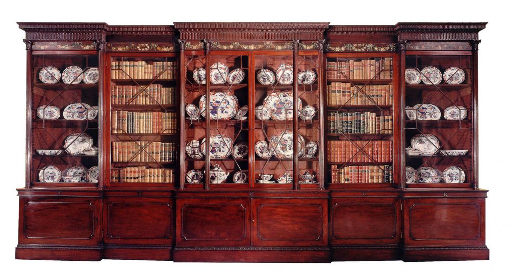 Sold in 2005, this magnificent double breakfront bookcase was reputed to have come from a stately home. The quality of the carving, the timber and the fire-gilt handles was exceptional.