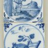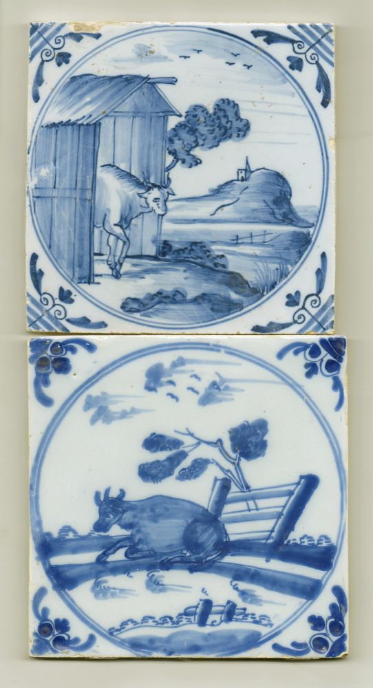 P118 An English blue and white delft tile of a cow coming out of a byre