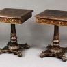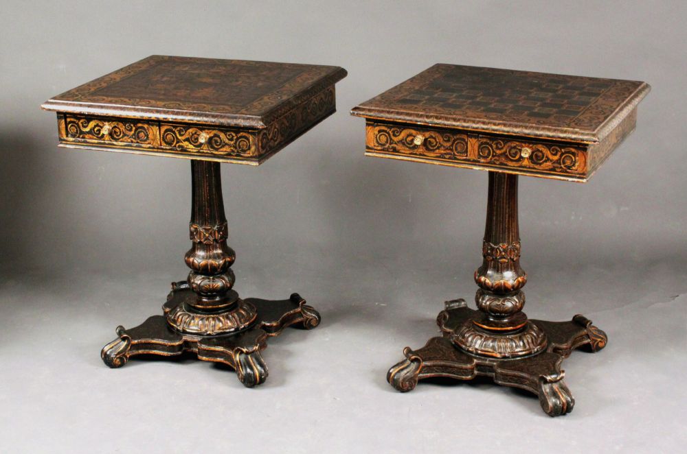 A rare pair of Chinese tables made for the export market; dragon’s blood varnish over silver gilt decoration on lacquer.