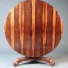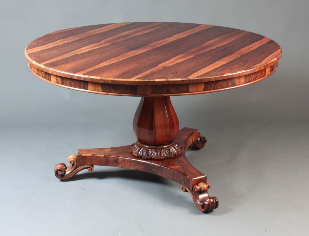 An early 19th century round table in exceptional rosewood veneers and well carved scroll feet