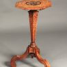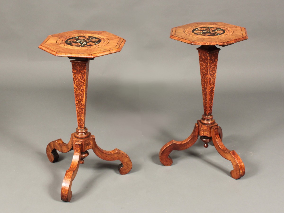 An attractive pair of nineteenth century Dutch walnut marquetry occasional tables; probably formerly torcheres