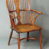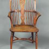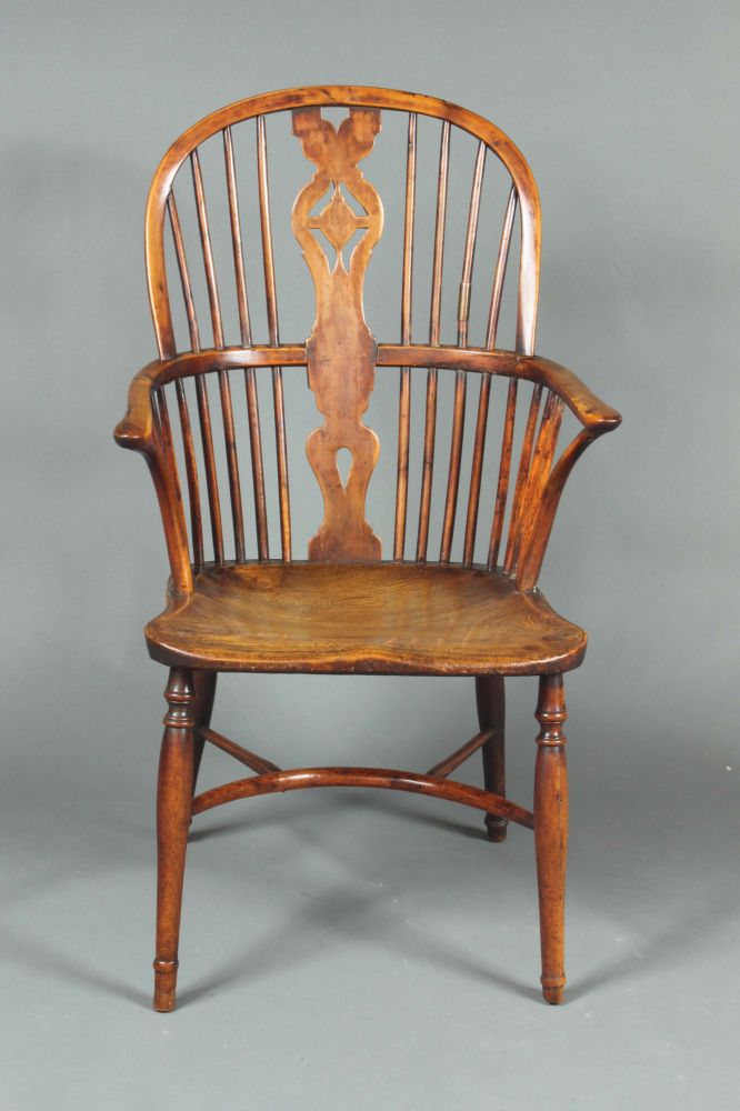 An early 19th century yewwood windsor chair of a good colour and patina. One spindle with a well-patinated repair in brass and the feet tipped