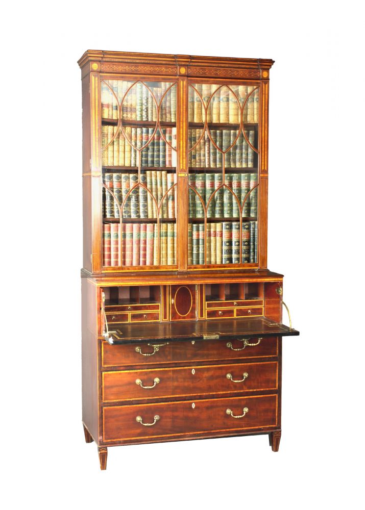 A fine quality George III mahogany secretaire bookcase with extensive inlays in satinwood, purpleheart, boxwood and ebony: a particularly fine interior with an inlaid oval to the door; mahogany lined drawers throughout and the original brass handles