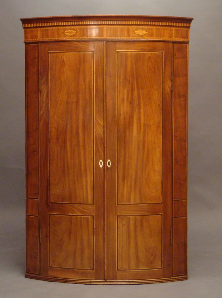 A fine George III Sheraton period bowfront mahogany corner cupboard of a superb pale colour and delicate inlay c. 1790