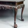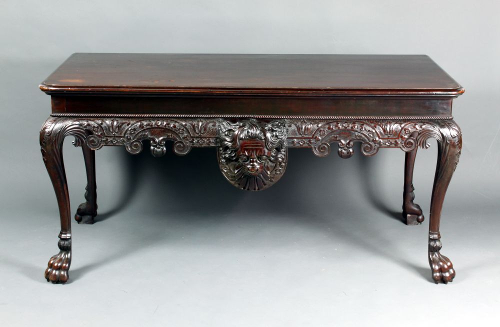 A good mid nineteenth century console table by the noted makers Strahan of Dublin: Irish furniture is usually polished to a darker colour than the English equivalent and this table is a lovely rich reddy brown.  The quality of the timber is exceptional; very heavy and hard and has been crisply carved.  The top appears to be made in re-used timber but in my opinion it is original.  However such console tables often have a black marble or slate and this could look spectacular.