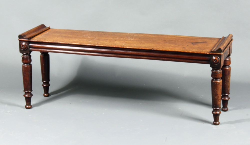 An 19th Century mahogany hall bench: larger than normal size and a good model with a moulded frieze and turned paterae - untouched colour and patina