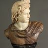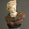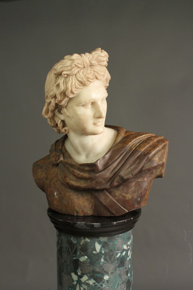 A spendid 'Grand Tour' white Carrara marble bust of Apollo after Canova with a most interesting choice of marble for his toga: this is a type of brown breccia which is composed of pebbles in a matrix; where the sculptor has carved into the stone the outline of the pebbles can clearly be seen.