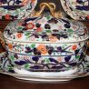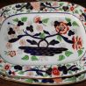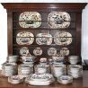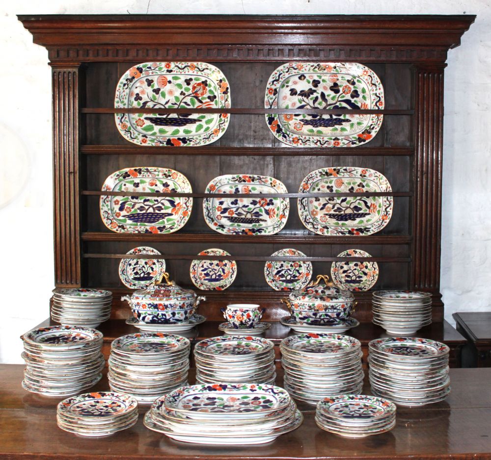 An extensive early 19th century ironstone dinner service with approximately 114 pieces.  Varying condition ~ many in very good order.  68 dinner plates, 17 side plates, 19 soup bowls and 8 retangular meat dishes, 2 soup tureens and covers, 1 cracked, 1 broken handle and not quite matching lid, sauce tureen (no lid).  Approximately 20 other pieces with faults but priced to allow for this.