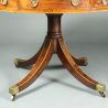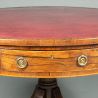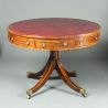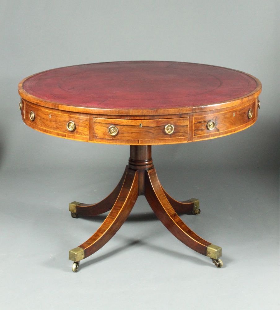 A fine George III drum table: good model in rosewood rather than mahogany; gun-barrel turned stem; attractive cross-banding and boxwood stringing to the top of the legs; mahogany lined drawers