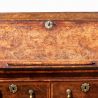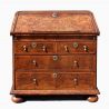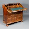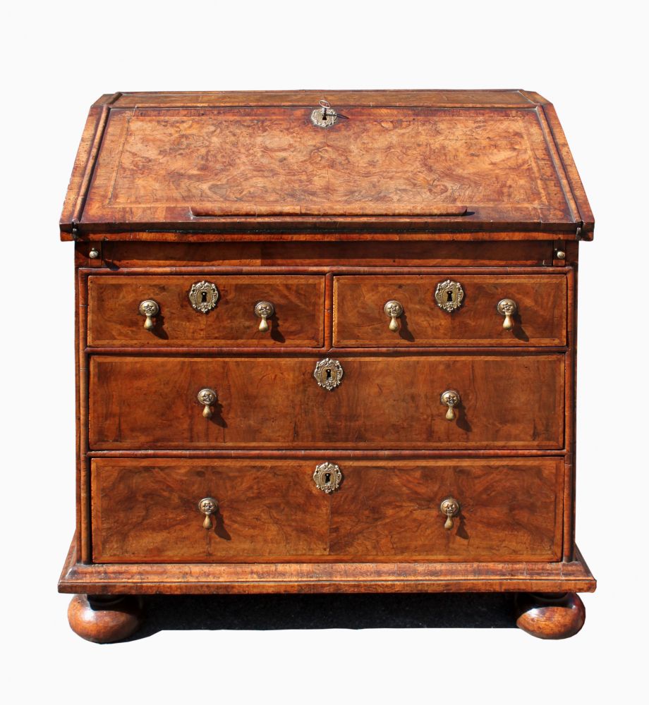 A good late seventeenth century veneered walnut bureau with chevron banding: attractive stepped interior and well, secret drawers within the well compartment. The bun feet and brasses in the correct style but not original.