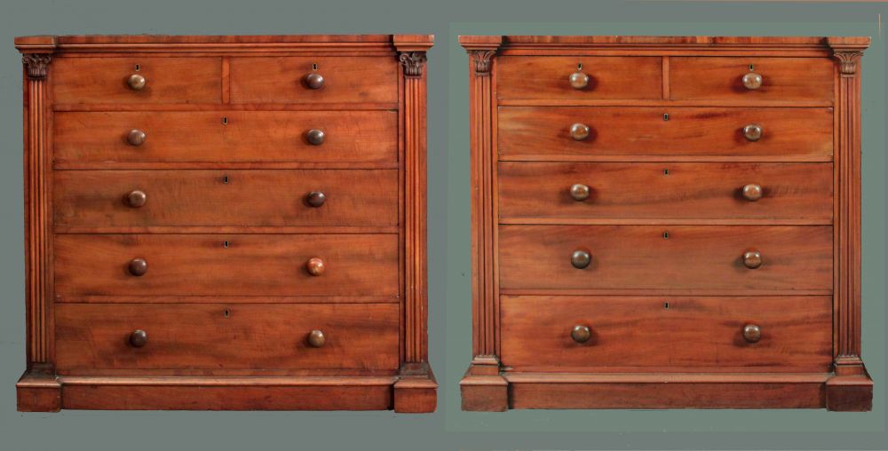 A near pair of fine quality chests of drawers in fiddle grain mahogany with oak drawer linings: