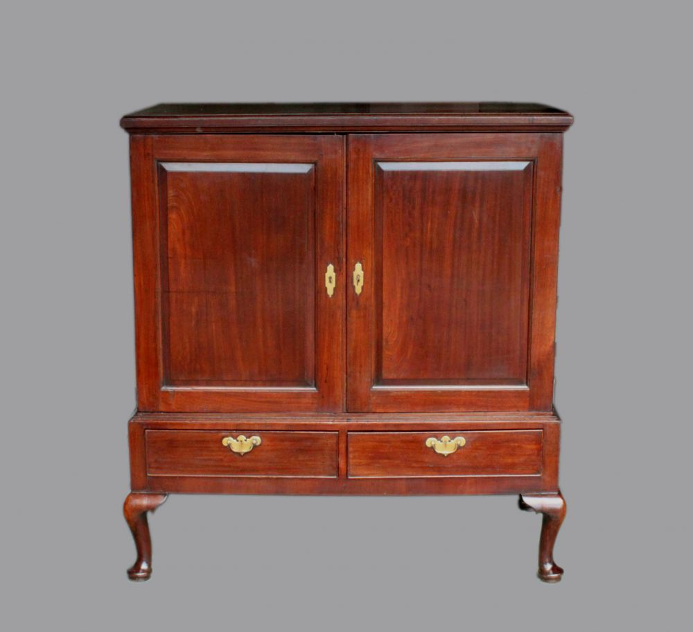 A rare George II low linen press on cabriole leg stand in mahogany of a good colour and patina.