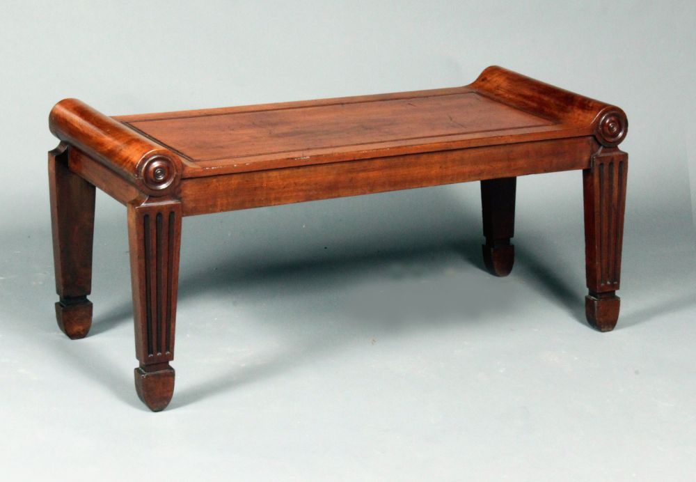 A Regency mahogany hall bench in the manner of Charles Heathcote Tatham whose design was inspired by a marble classical Roman seat.
