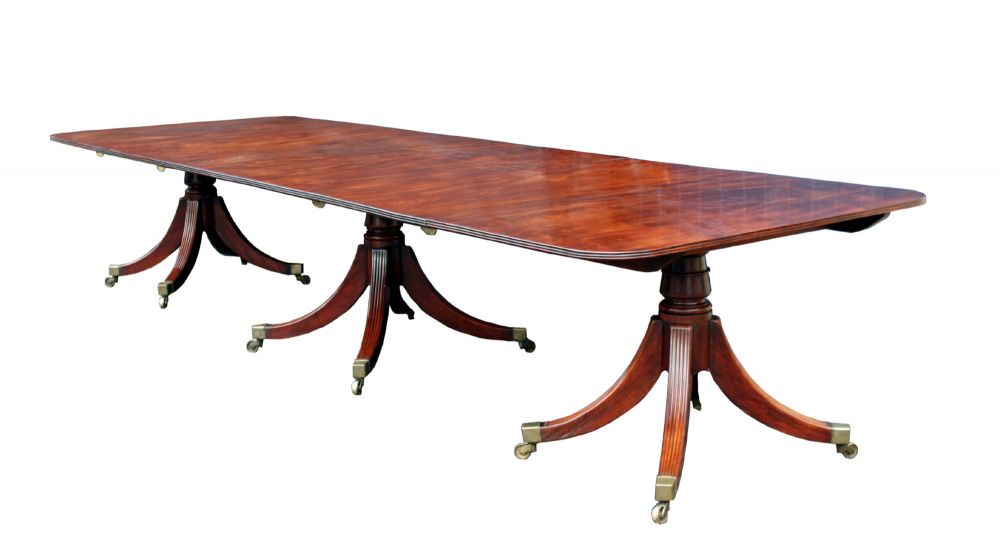 A three-pillar dining table in well figured mahogany:  the top and the bases are both in lovely Georgian timber but screw holes under the top suggest that it was from another table; seats 14 - 16