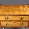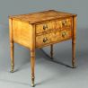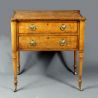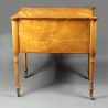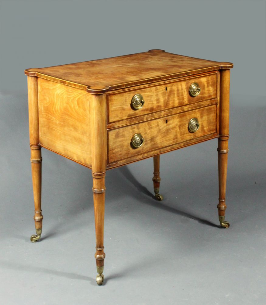 A fine Regency satinwood and rosewood crossbanded writing table. The eared top above a fitted mahogany lined drawer with a ratcheted baize-lined slope and a further drawer lined in cedar wood, original handles and turned tapering legs and castors.
