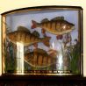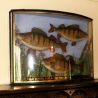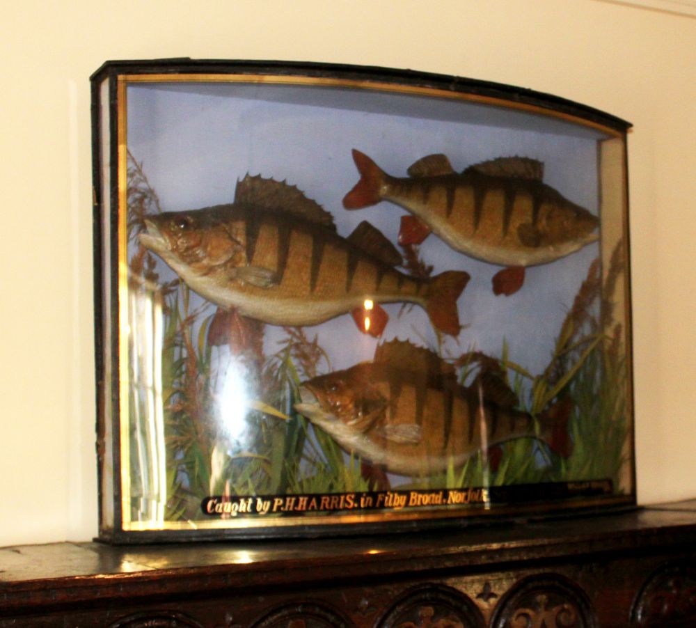 A bowfront cased group of three perch, preserved by W Lowne, Fuller's Hill Aviaries, Great Yarmouth. The glass with gilt lettering: caught by P W Harrison in Filby Broad, Norfolk, Sept 6th 1911, total weight 10 3/4lb. Printed label to the back; both lower corners of the glass cracked, though this in not obvious.