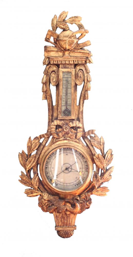 A fine late 18th century French barometer in carved giltwood with a pair of doves, laurel leaves and a globe - the barometer in good working order unlike the thermometer