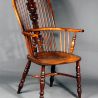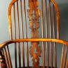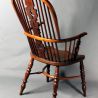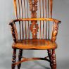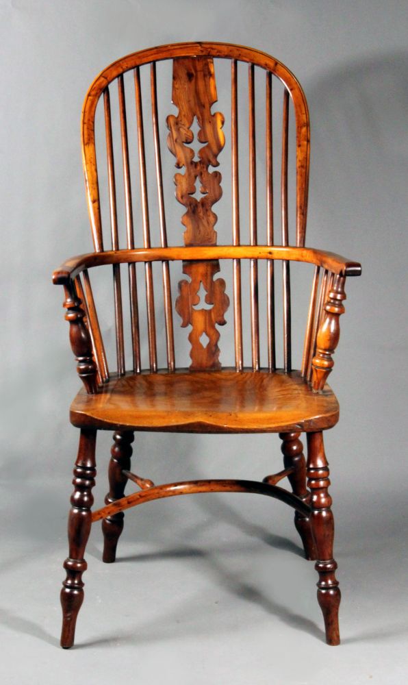 A good high back yew wood windsor chair with crinoline stretcher and Christmas tree splat