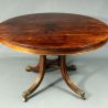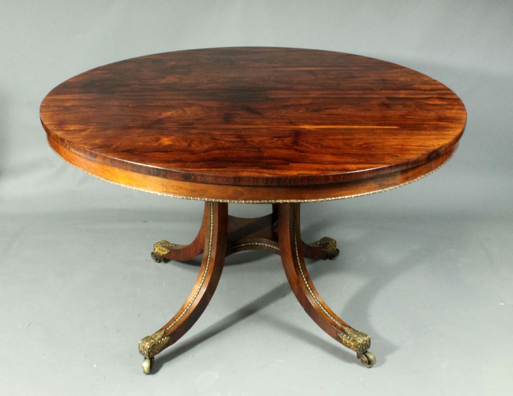 A fine Regency rosewood centre table with brass rope twist moulding to the frieze, sabre legs and concave platform stretcher; good original oak leaf casters.