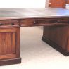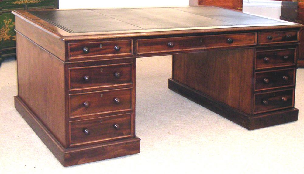 Large and handsome mid-nineteenth Century mahogany partners desk with the original knobs; two doors at the back; black hide liner