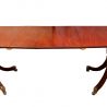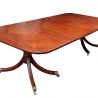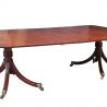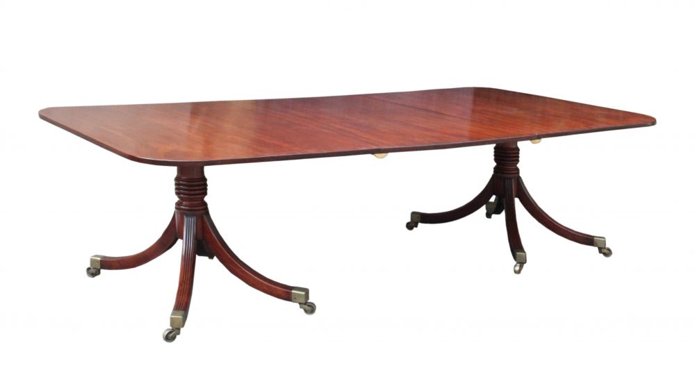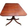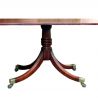 Georgian dining table in figured mahogany on handsome four-splay twin pillar bases with brass casters