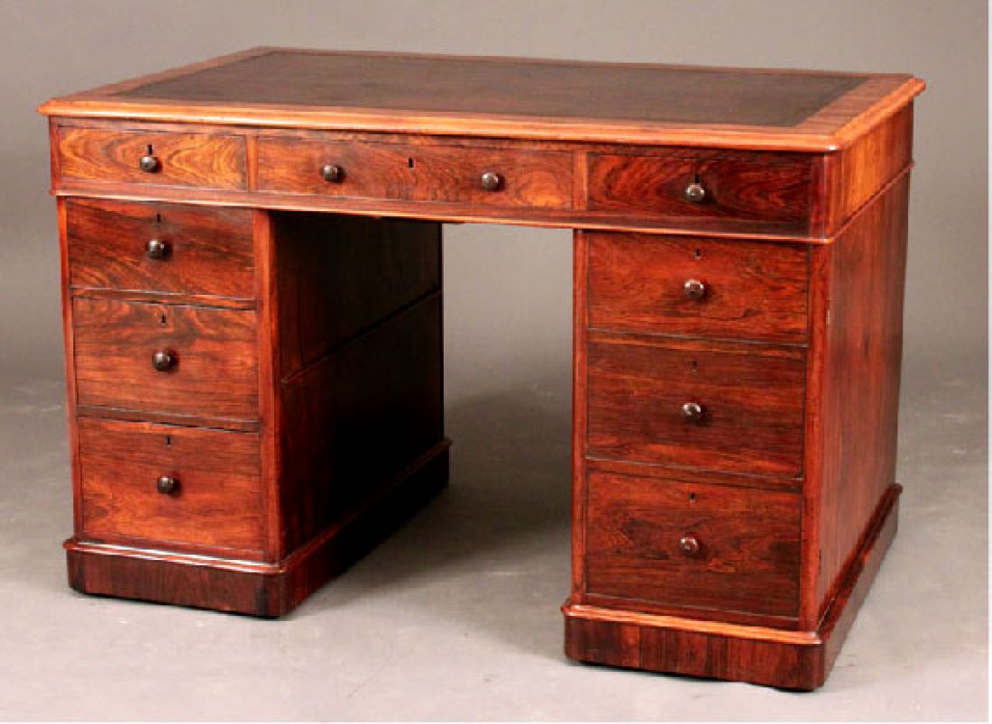 Rare small partners desk in rosewood of a good soft colour: two banks of drawers in the front and at the back drawers along the top with cupboard doors on the pedestal bases which are disguised as more drawers. Stamped Wilkinson of Ludgate Hill, London