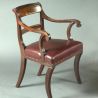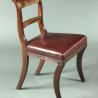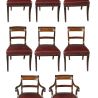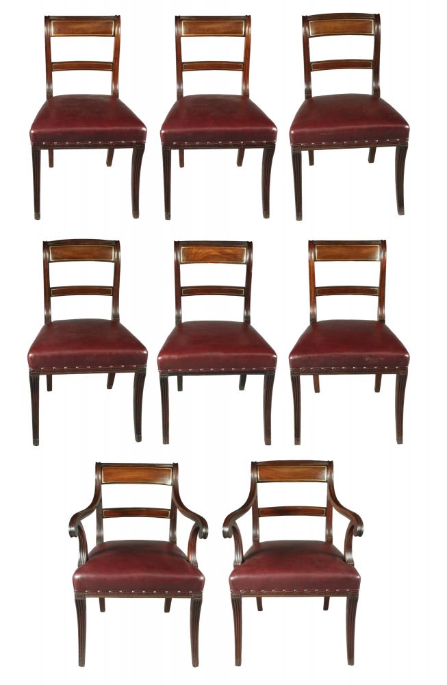 A good set of 8 Regency sabre leg dining chairs in mahogany with brass stringing to the backs; two carver chairs and six singles; red leather seats.