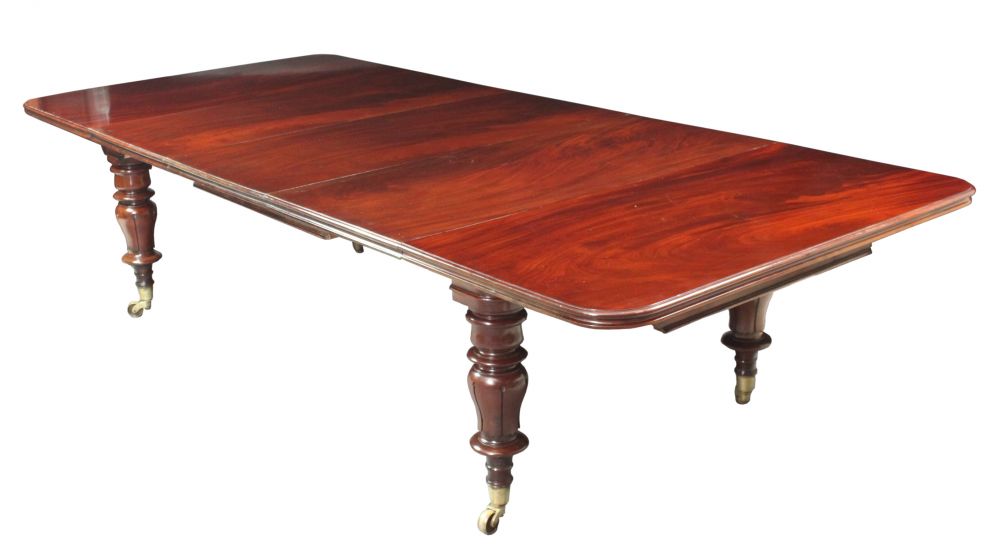A large and fine quality early Victorian mahogany extending dining table with maker's label for W.Paton.  Exceptional figured leaves with clips impressed Cope & Austin 1840.  Well carved bulbous legs and original casters.  Original mahogany extending action.