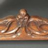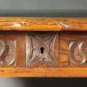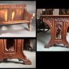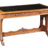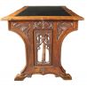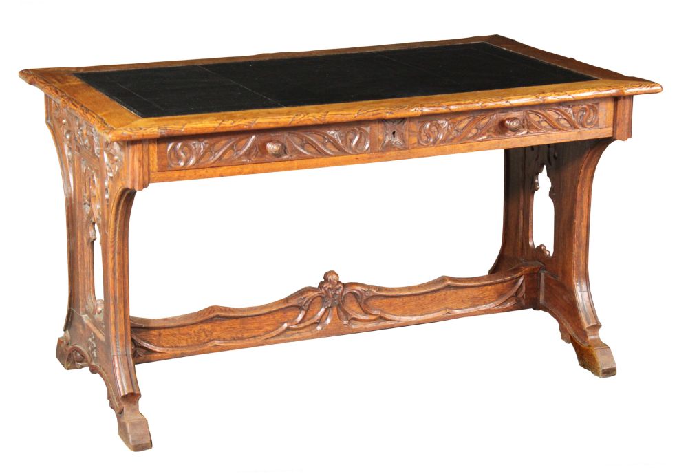 A rare neo-Gothic writing table with superb carved detail mainly in a foliate design: striking pointed-arch pierced ends and carved stretcher, knobs and escutcheon; the rectangular top with carved edges and an inset black leather; good original colour and patina.