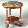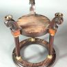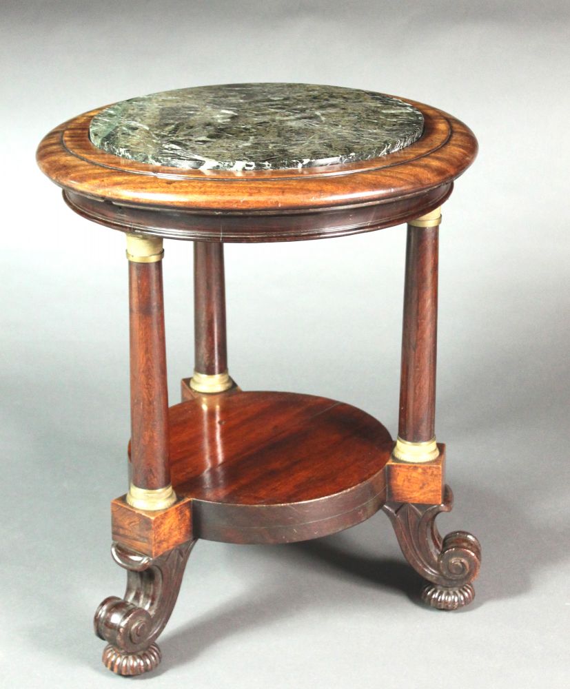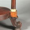 A fine Regency mahogany low table or stand; the pillars in simulated rosewood with brass collars and superb carved scroll feet with inset castors.