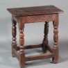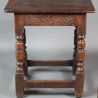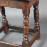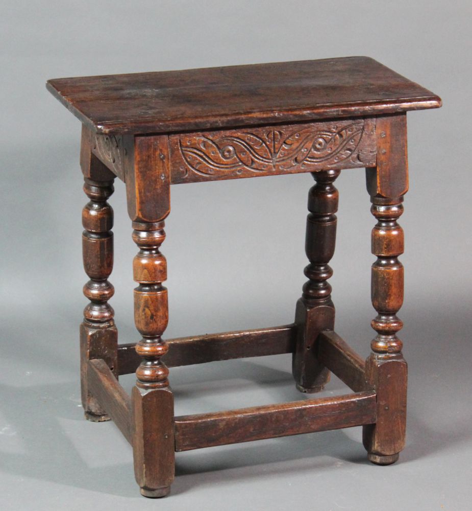 An 17th Century oak joined stool of a lovely colour and patina: baluster turning on the legs and a carved frieze. Two of the stretchers are probably old replacements
