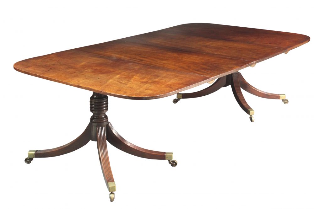 Georgian dining table in mahogany of a good rich colour and patina on elegant twin pedestals with four splay reeded sabre legs.