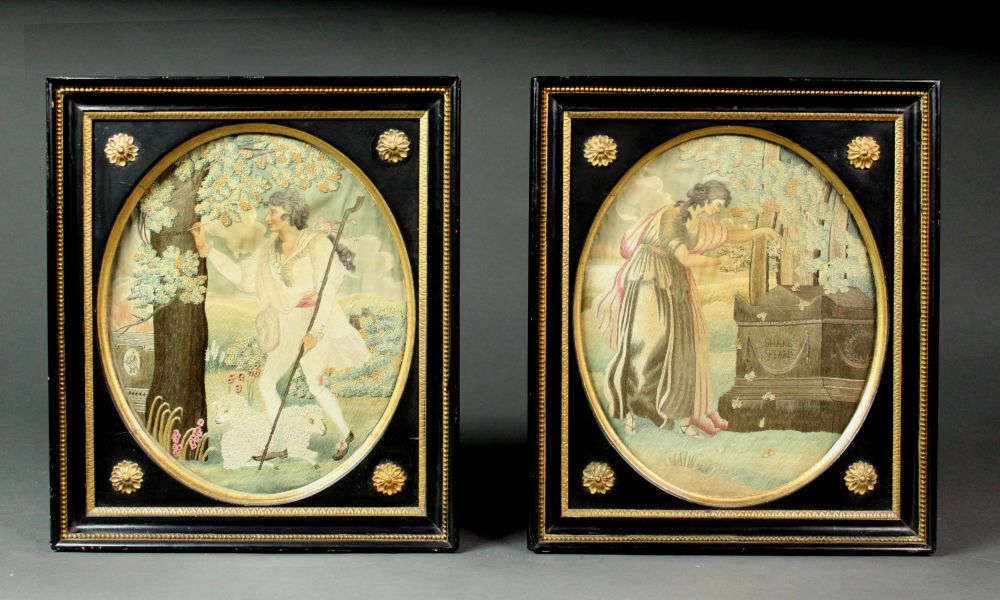 An exceptional pair of Regency needleworks in silk in their original frames: Constantine and Shakespeare.